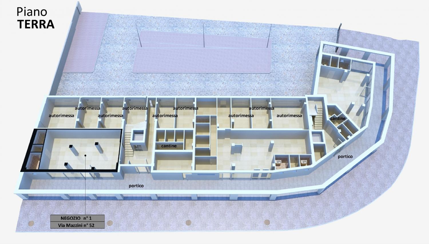 Questo locale al piano terra è riparato dall'elegante porticato condominiale, si affaccia su Via Mazzini ed è dotato di ampie vetrine.