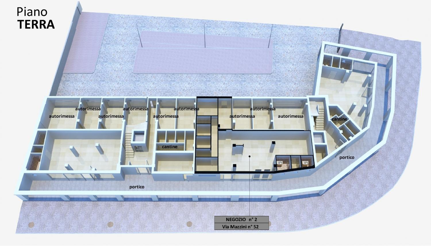 Questo locale al piano terra è riparato dall'elegante porticato condominiale, si affaccia su Via Mazzini ed è dotato di ampie vetrine.