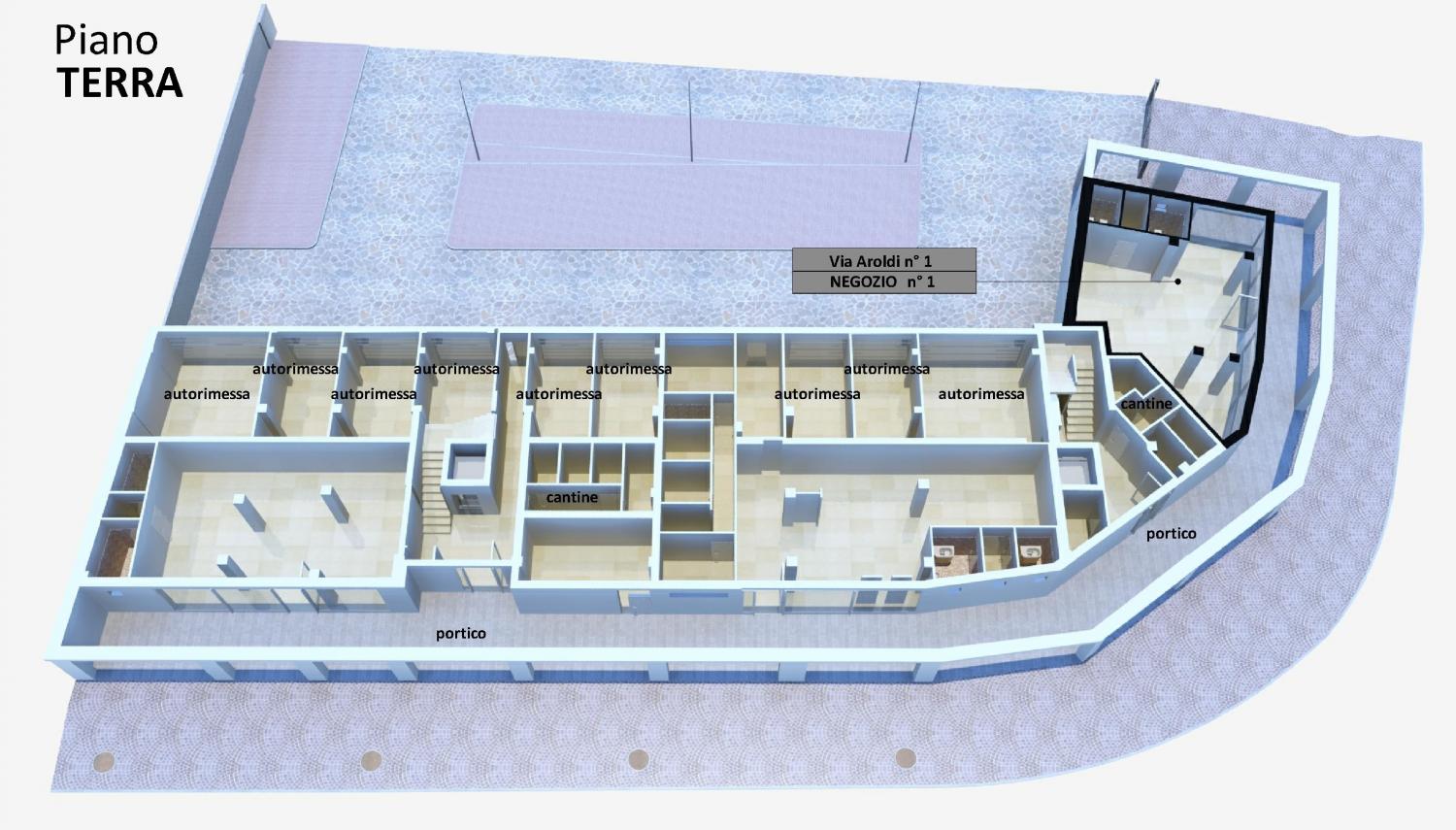 Questo locale al piano terra è riparato dall'elegante porticato condominiale, si affaccia su Via Mazzini ed è dotato di ampie vetrine.